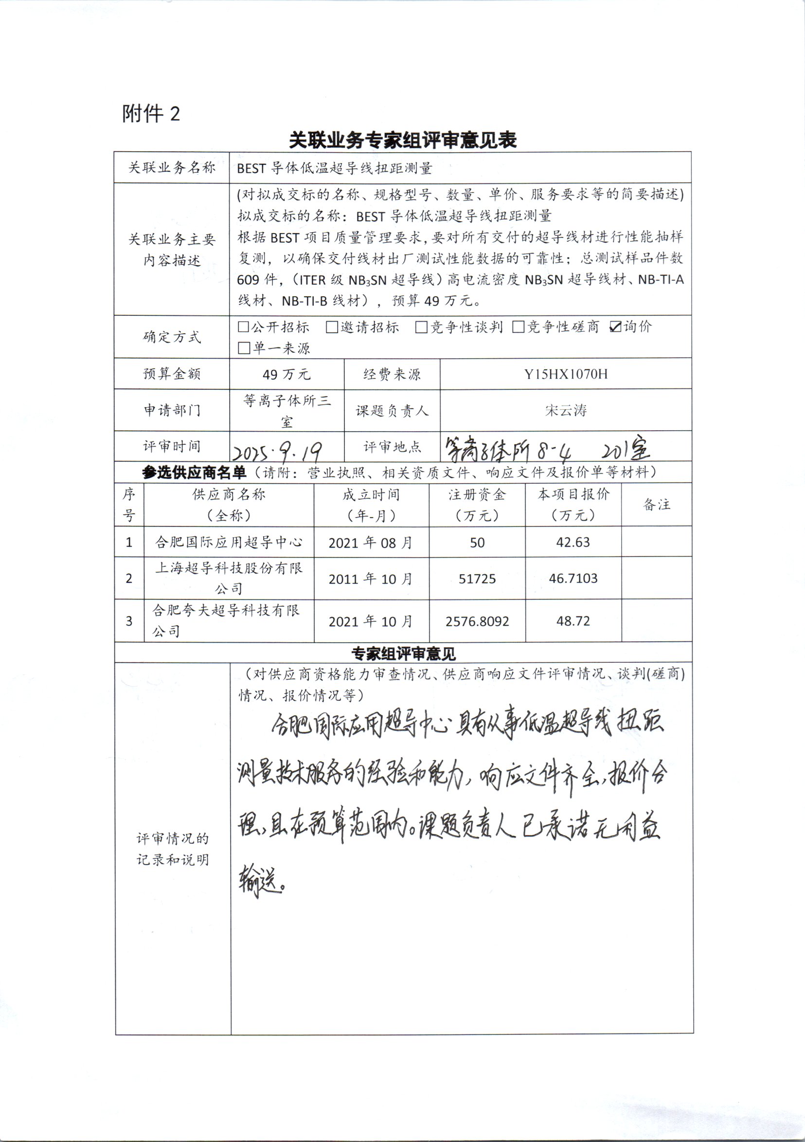 BEST导体低温超导线扭矩测试,数量609件,单价700元,总计人民币426300元。