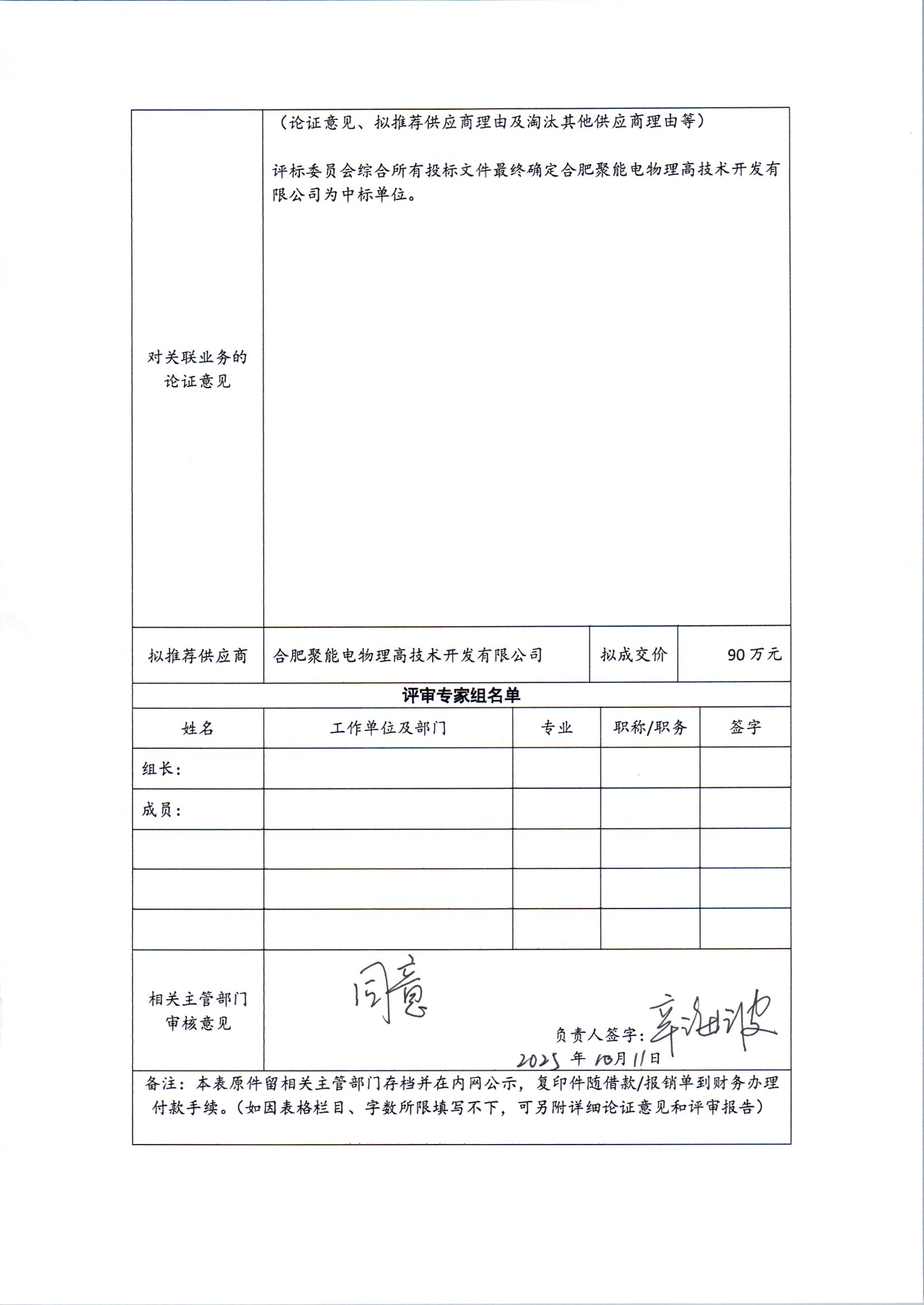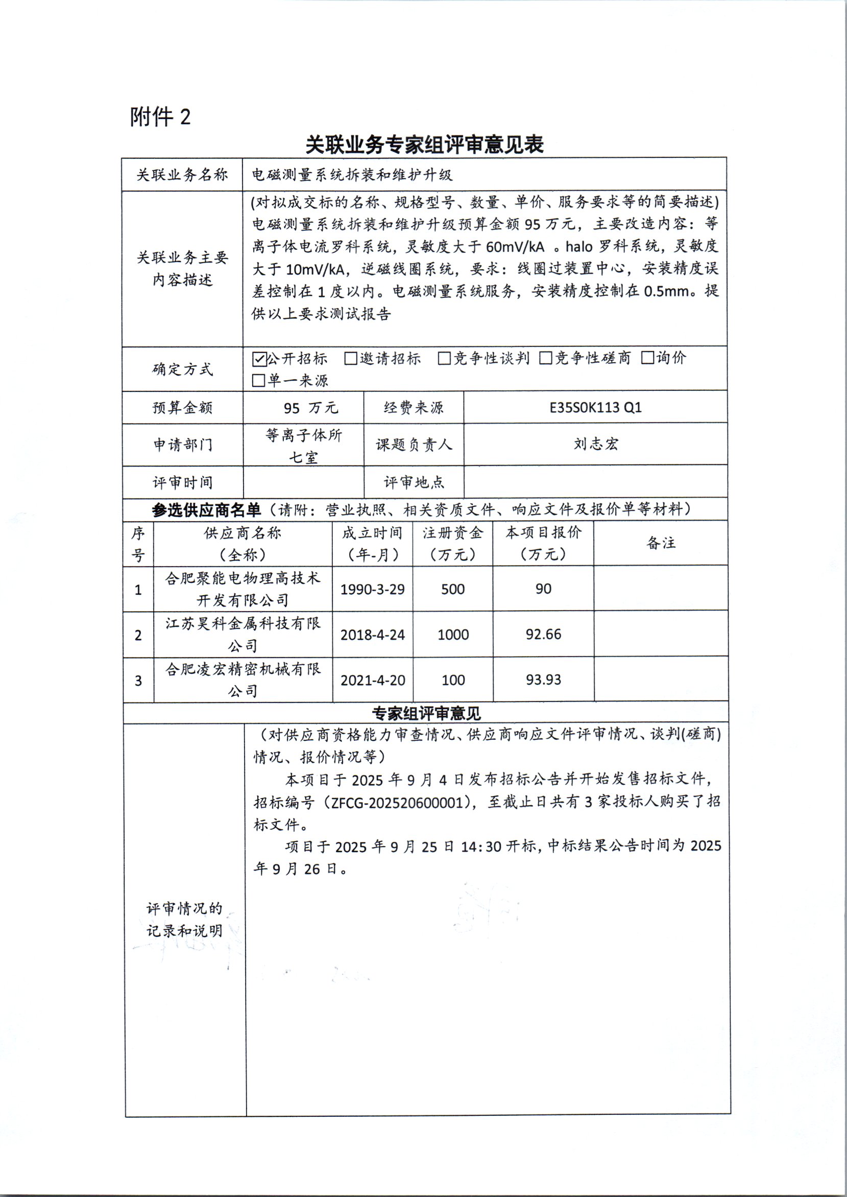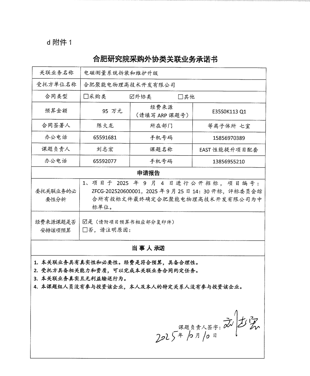 根据《中国科学院关于加强科研项目关联业务管理的暂行规定》(科发条财字〔2015〕125号)、《中国科学院合肥物质科学研究院关于加强科研项目关联业务管理的实施细则》(科合院发资字〔2021〕8号)、《合肥研究院加强关联业务管理暂行办法》(科合院发资字〔2022〕 1号)、《合肥物质院加强关联业务管理补充规定》(科合院发资字〔2025〕1号)要求,现就我院委托合肥聚能电物理高技术开发有限公司进行电磁测量系统拆装和维护升级的关联业务做公示。