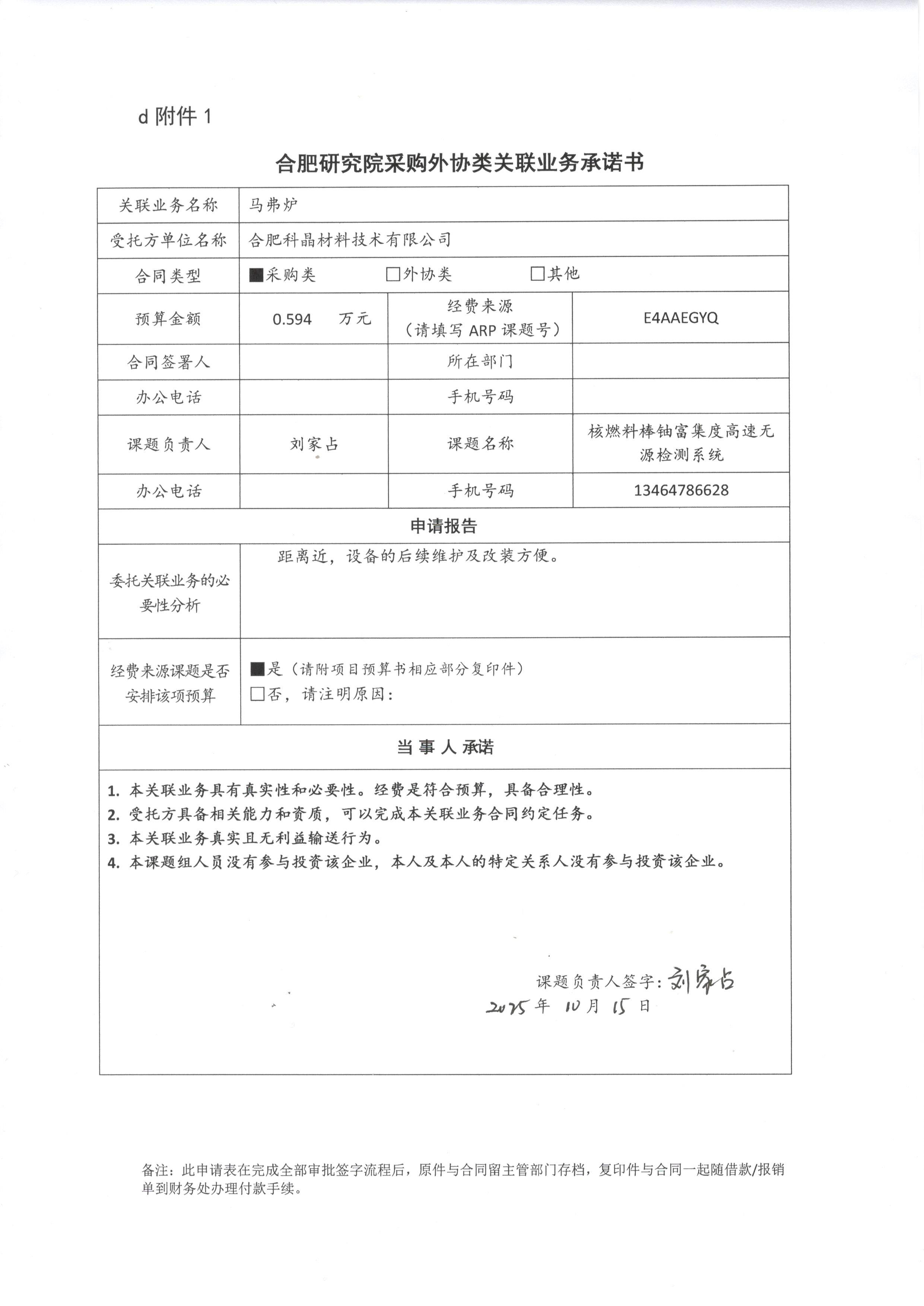 根据《中国科学院关于加强科研项目关联业务管理的暂行规定》(科发条财字〔2015〕125号)、《中国科学院合肥物质科学研究院关于加强科研项目关联业务管理的实施细则》(科合院发资字〔2021〕8号)、《合肥研究院加强关联业务管理暂行办法》(科合院发资字〔2022〕1号)、《合肥物质院加强关联业务管理补充规定》(科合院发资字〔2025〕1号)要求,现就我院从合肥科晶材料技术有限公司购买马弗炉进行关联业务公示。