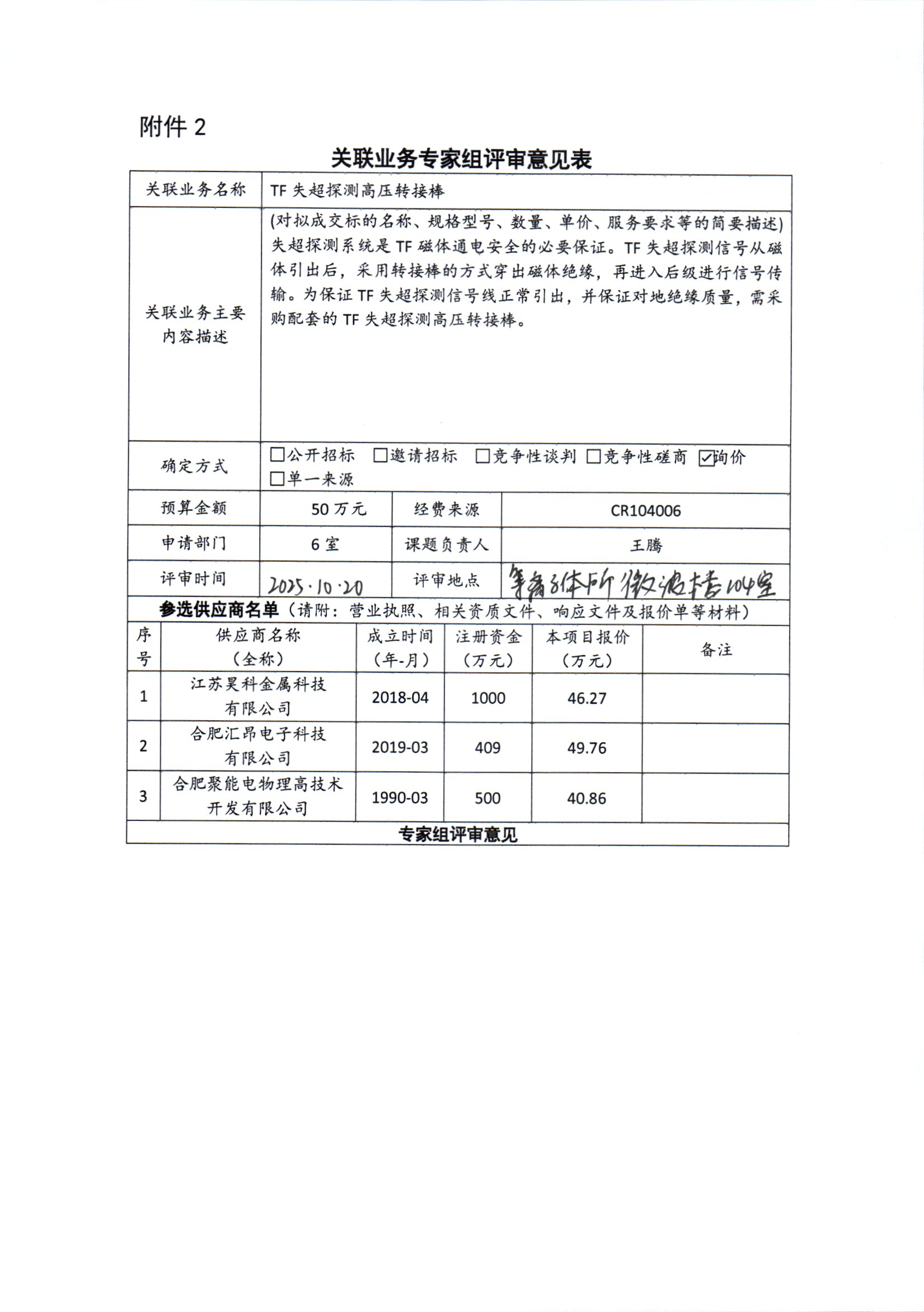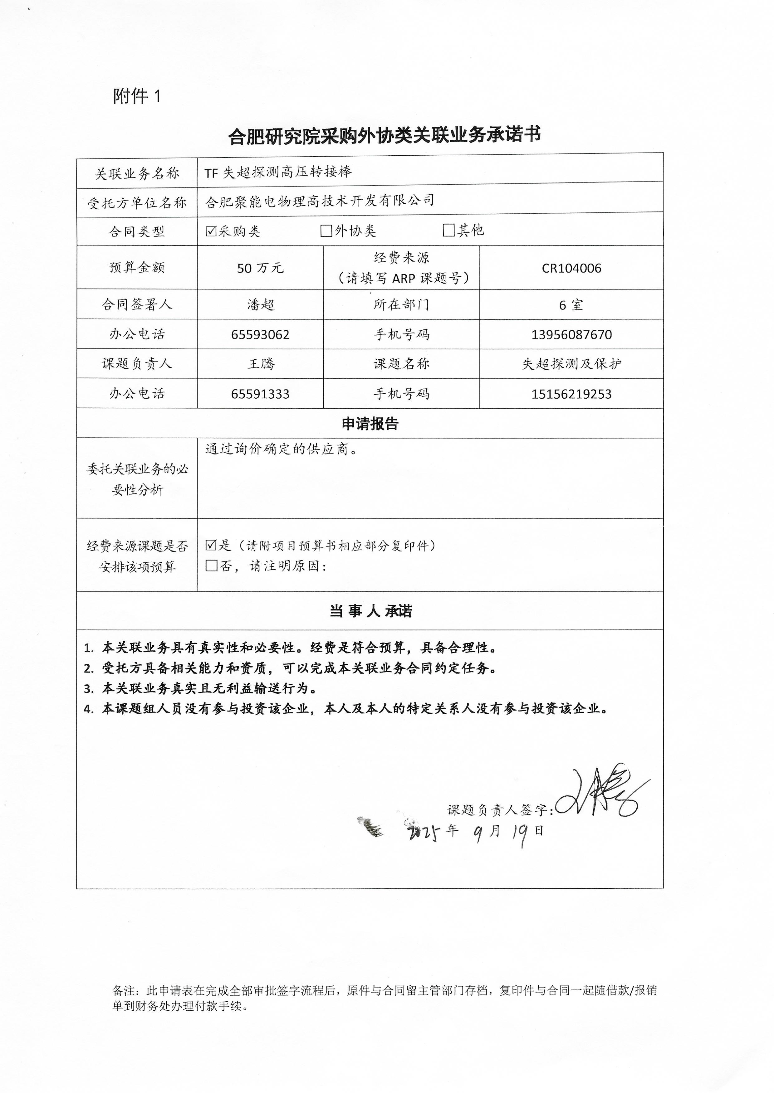 中国科学院合肥物质科学研究院等离子体物理研究所王腾老师向合肥聚能电物理高技术开发有限公司采购TF失超探测高压转接棒。该批设备应用于CRAFT环向场(TF)磁体失超探测及保护系统,TF失超探测信号从磁体引出后,利用转接棒穿出磁体绝缘,再进入后级进行信号传输。高压转接棒可以实现与线圈的整体VPI处理,这样可以确保失超探测信号线的安全和可靠,并保证对地绝缘质量。合肥聚能电物理高技术开发有限公司股东之一为合肥科学岛控股有限公司,该公司在其中占股35%,本次构成关联业务交易。