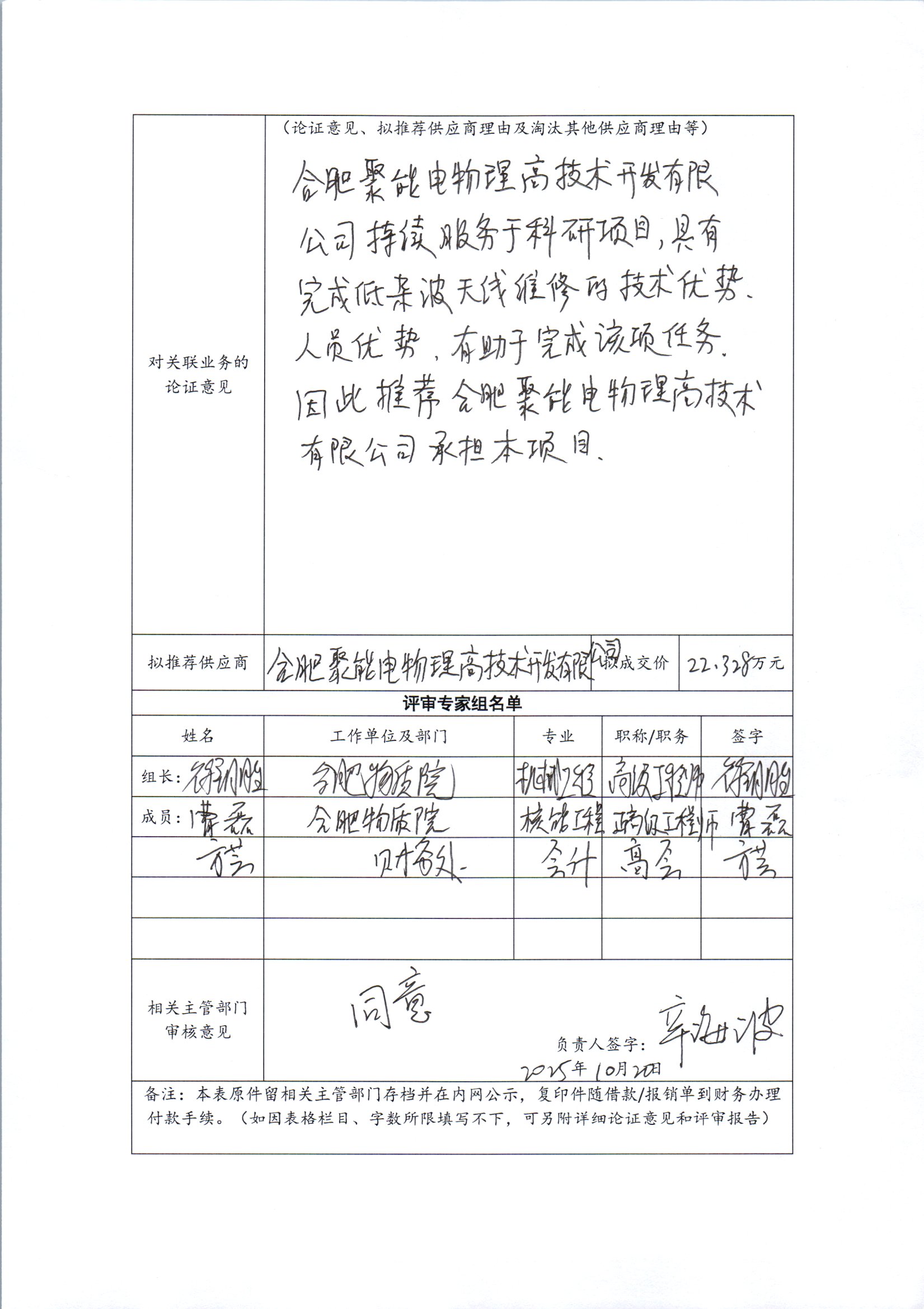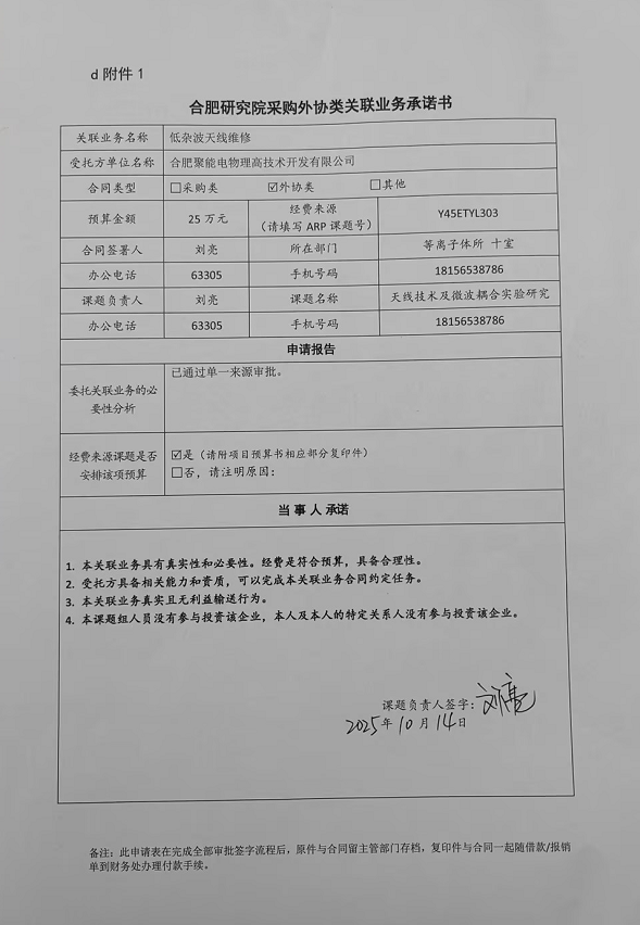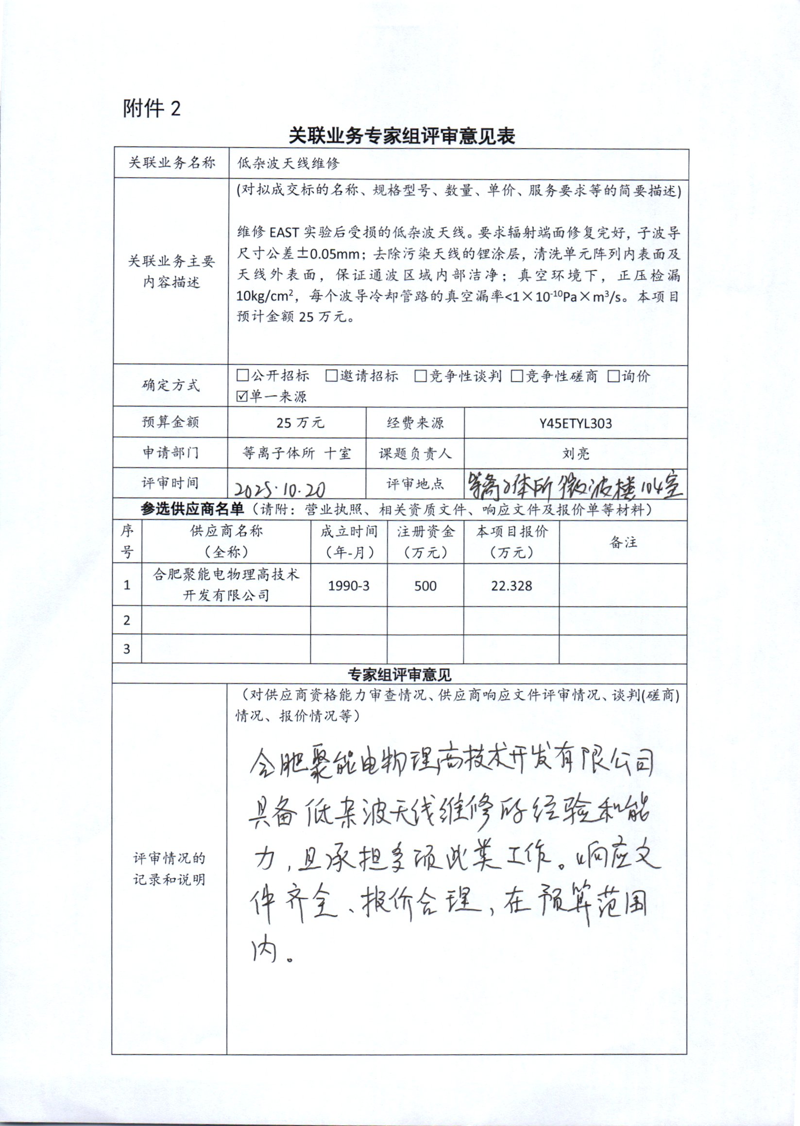 根据《中国科学院关于加强科研项目关联业务管理的暂行规定》(科发条财字〔2015〕125号)、《中国科学院合肥物质科学研究院关于加强科研项目关联业务管理的实施细则》(科合院发资字〔2021〕8号)、《合肥研究院加强关联业务管理暂行办法》(科合院发资字〔2022〕 1号)、《合肥物质院加强关联业务管理补充规定》(科合院发资字〔2025〕1号)要求,现就我院委托合肥聚能电物理高技术开发有限公司进行低杂波天线维修的关联业务做公示。