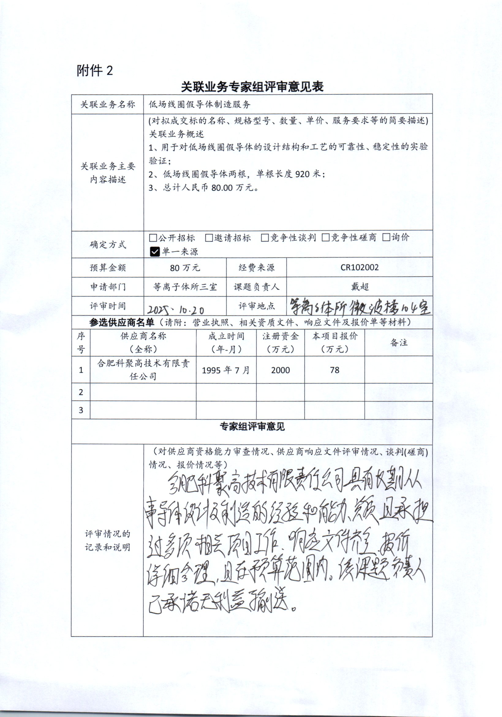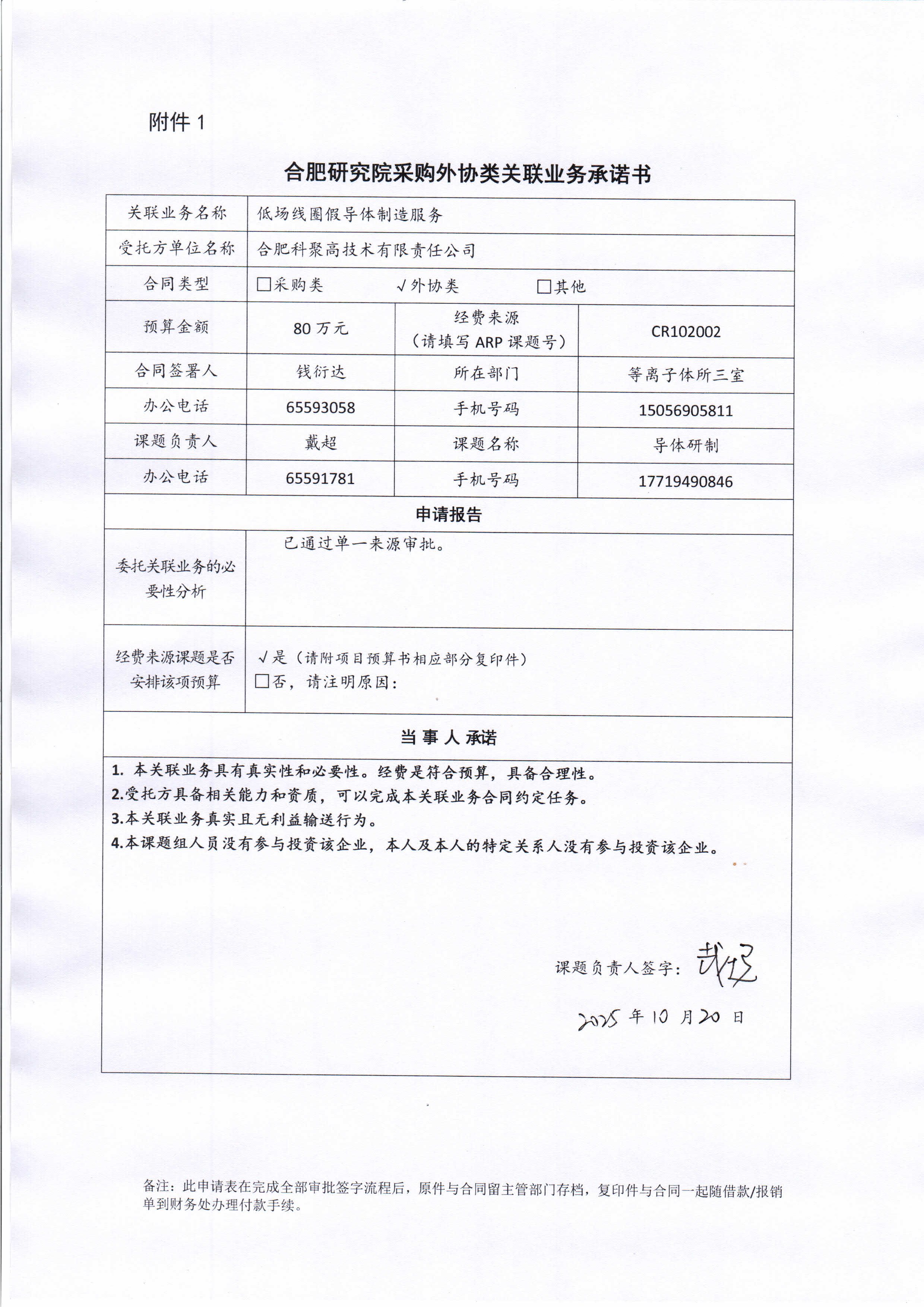 根据《中国科学院关于加强科研项目关联业务管理的暂行规定》(科发条财字〔2015〕125号)、《中国科学院合肥物质科学研究院关于加强科研项目关联业务管理的实施细则》(科合院发资字〔2021〕8号)、《合肥研究院加强关联业务管理暂行办法》(科合院发资字〔2022〕1号)、《合肥物质院加强关联业务管理补充规定》(科合院发资字〔2025〕1号)要求,现就委托合肥科聚高技术有限责任责任公司进行低场线圈假导体制造服务的关联业务做公示。