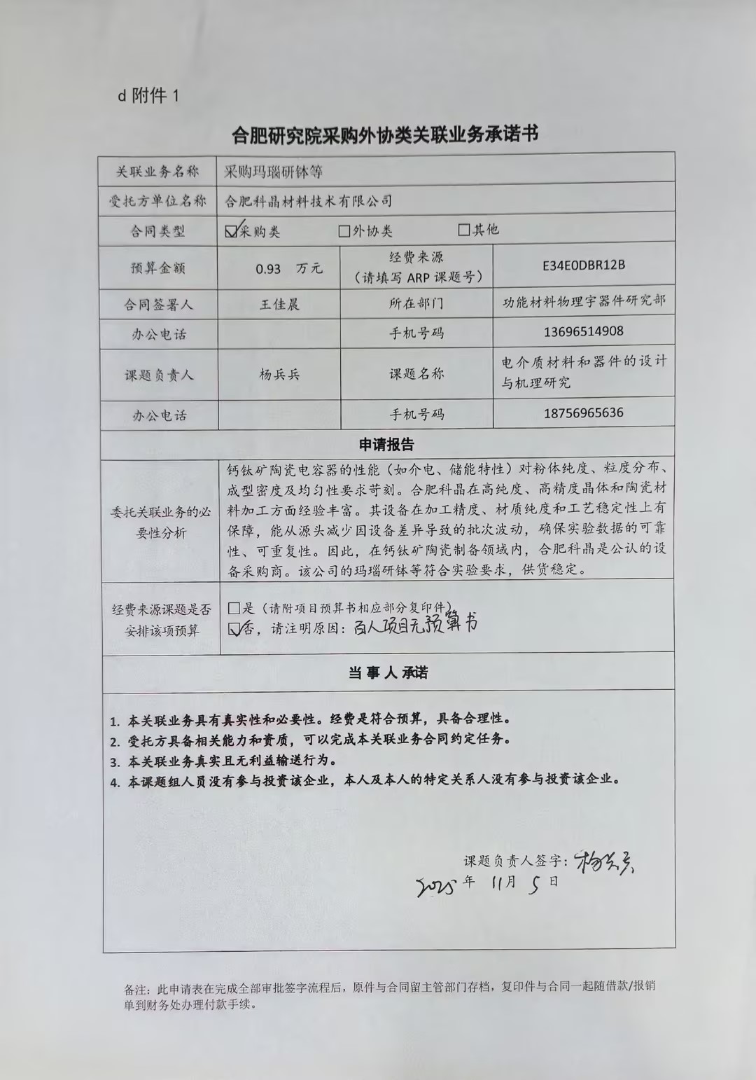根据《中国科学院关于加强科研项目关联业务管理的暂行规定》(科发条财字〔2015〕125号)、《中国科学院合肥物质科学研究院关于加强科研项目关联业务管理的实施细则》(科合院发资字〔2021〕8号)、《合肥研究院加强关联业务管理暂行办法》(科合院发资字〔2022〕1号)、《合肥物质院加强关联业务管理补充规定》(科合院发资字〔2025〕1号)要求,现就我院从合肥科晶材料技术有限公司采购玛瑙研钵等进行关联业务公示。