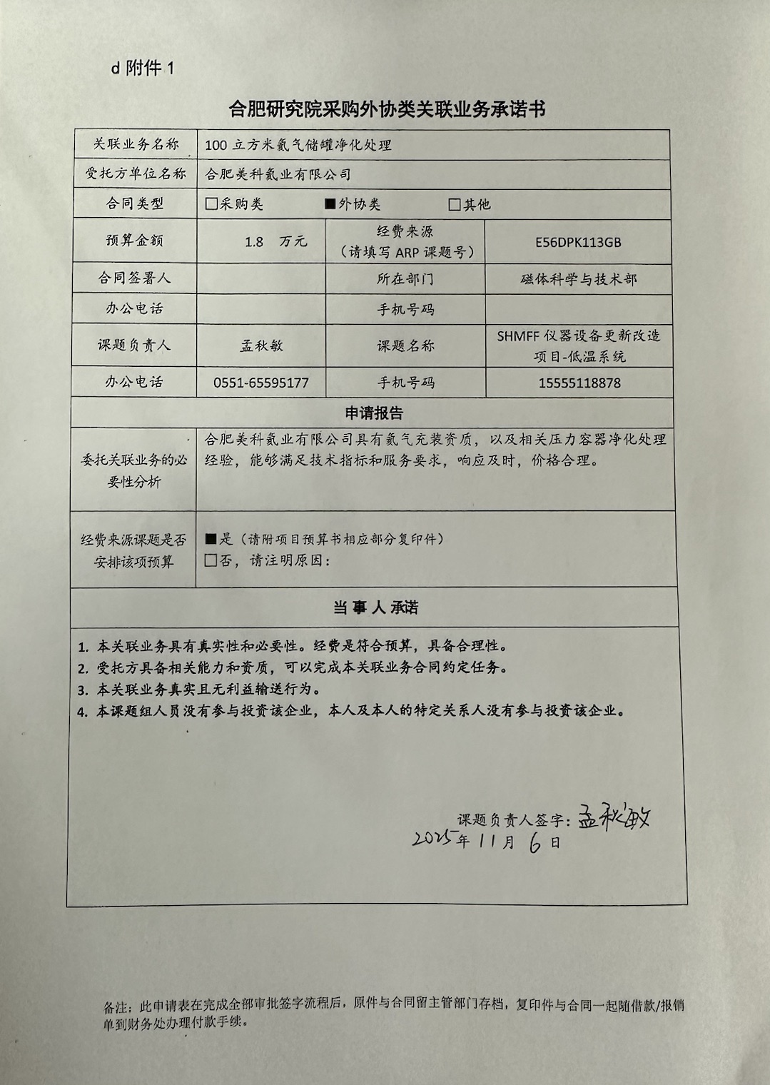 根据《中国科学院关于加强科研项目关联业务管理的暂行规定》(科发条财字〔2015〕125号)、《中国科学院合肥物质科学研究院关于加强科研项目关联业务管理的实施细则》(科合院发资字〔2021〕8号)、《合肥研究院加强关联业务管理暂行办法》(科合院发资字〔2022〕 1号)、《合肥物质院加强关联业务管理补充规定》(科合院发资字〔2025〕1号)要求,现就我院委托合肥美科氦业有限公司进行100立方米氦气储罐净化处理的关联业务做公示。