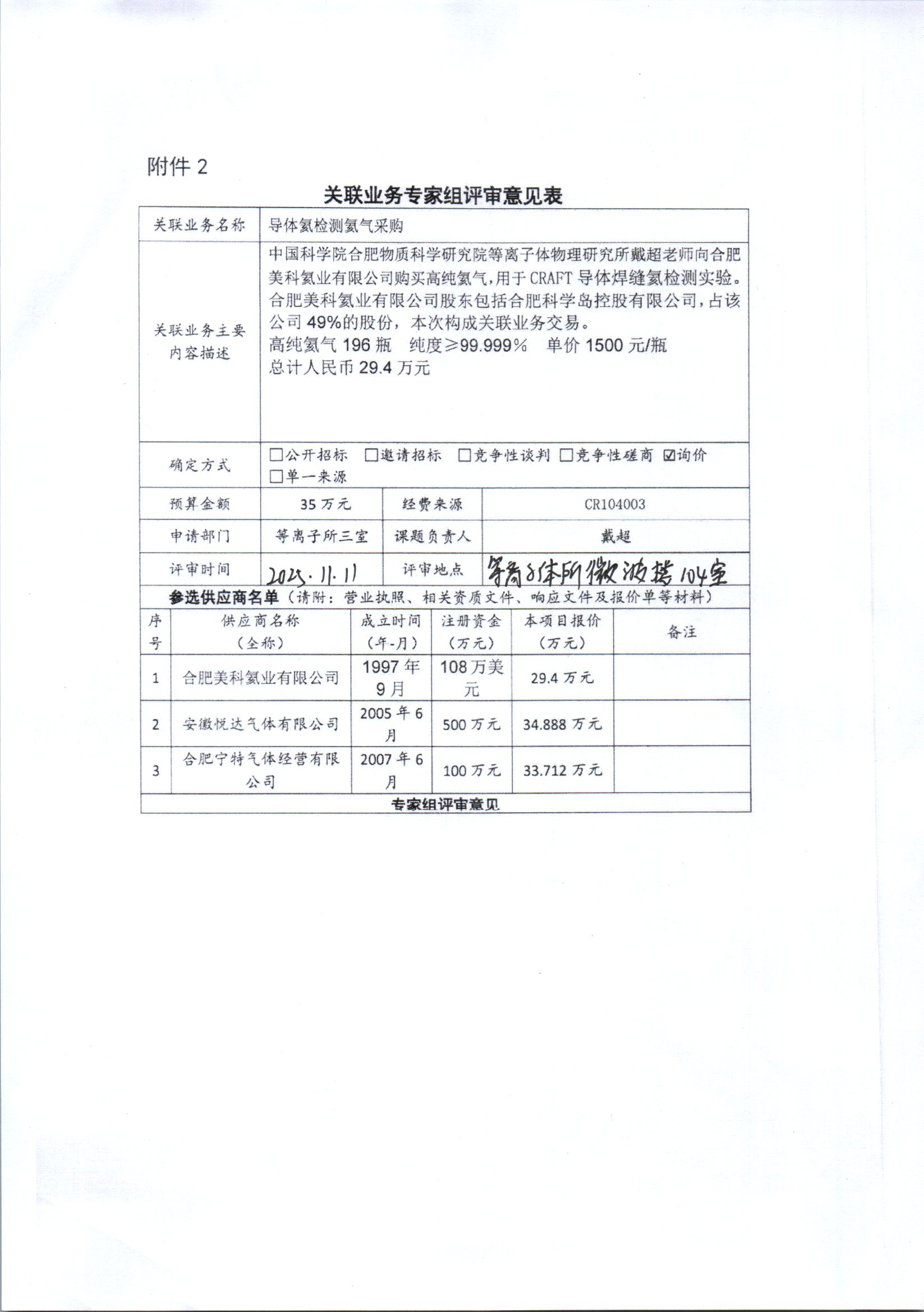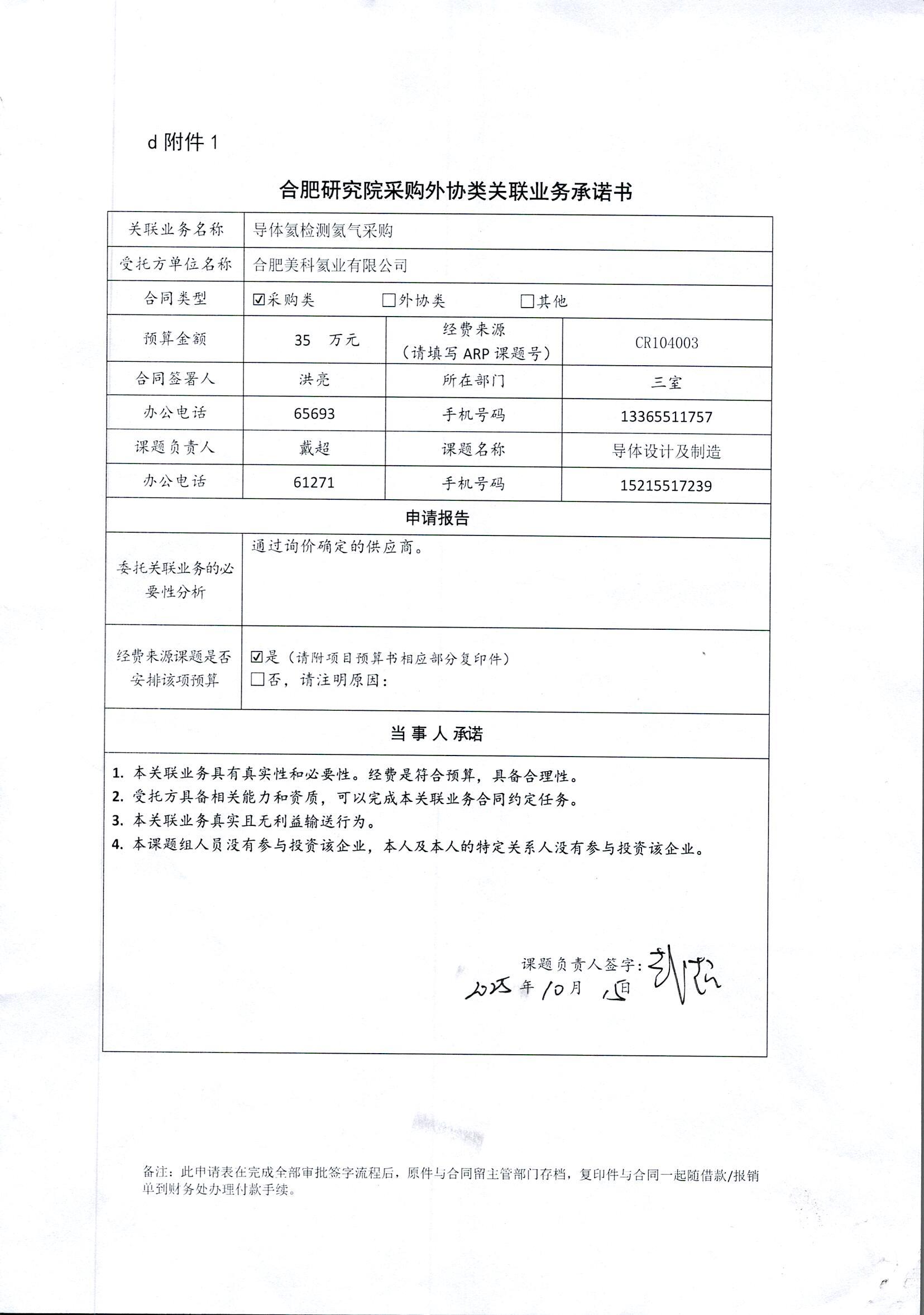 根据《中国科学院关于加强科研项目关联业务管理的暂行规定》(科发条财字〔2015〕125号)、《中国科学院合肥物质科学研究院关于加强科研项目关联业务管理的实施细则》(科合院发资字〔2021〕8号)、《合肥研究院加强关联业务管理暂行办法》(科合院发资字〔2022〕 1号)、《合肥物质院加强关联业务管理补充规定》(科合院发资字〔2025〕1号)要求,现就我院从合肥美科氦业有限公司购买导体氦检测氦气的关联业务做公示。