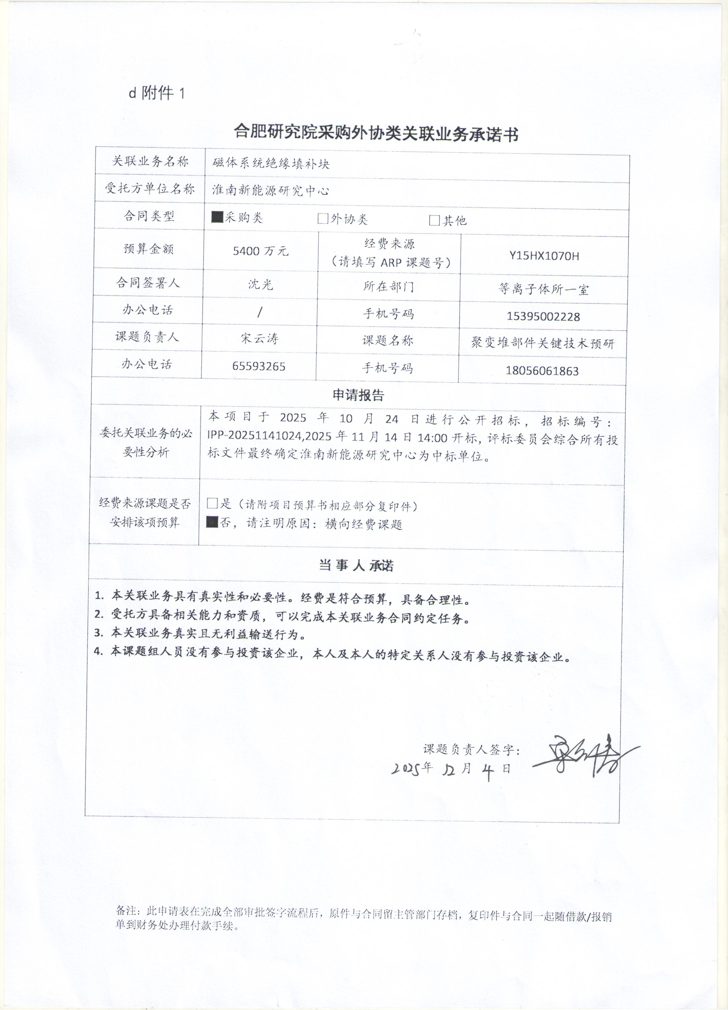 根据《中国科学院关于加强科研项目关联业务管理的暂行规定》(科发条财字〔2015〕125号)、《中国科学院合肥物质科学研究院关于加强科研项目关联业务管理的实施细则》(科合院发资字〔2021〕8号)、《合肥研究院加强关联业务管理暂行办法》(科合院发资字〔2022〕1号)、《合肥物质院加强关联业务管理补充规定》(科合院发资字〔2025〕1号)要求,现就我院从淮南新能源研究中心采购磁体系统绝缘填补块关联业务进行公示。