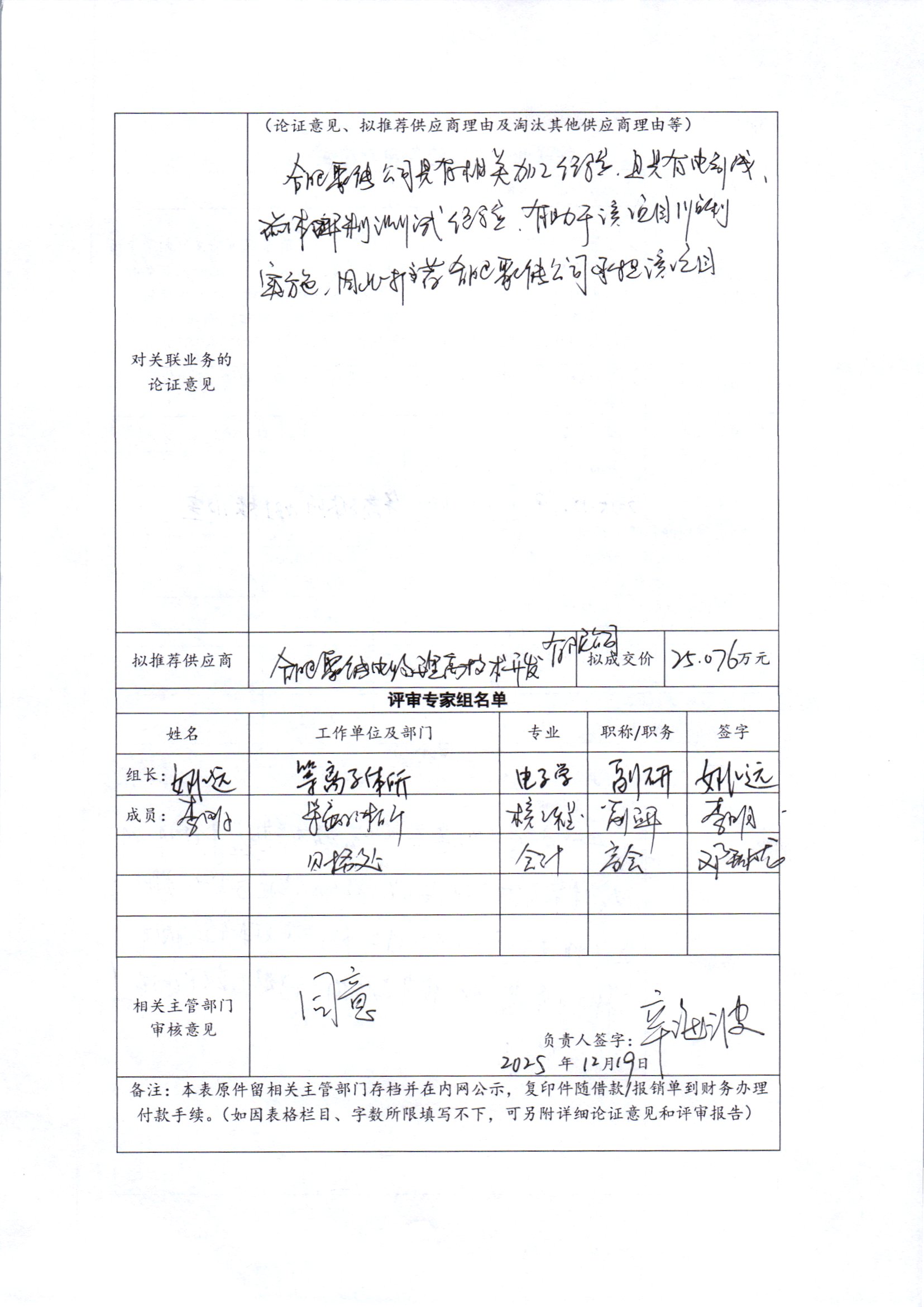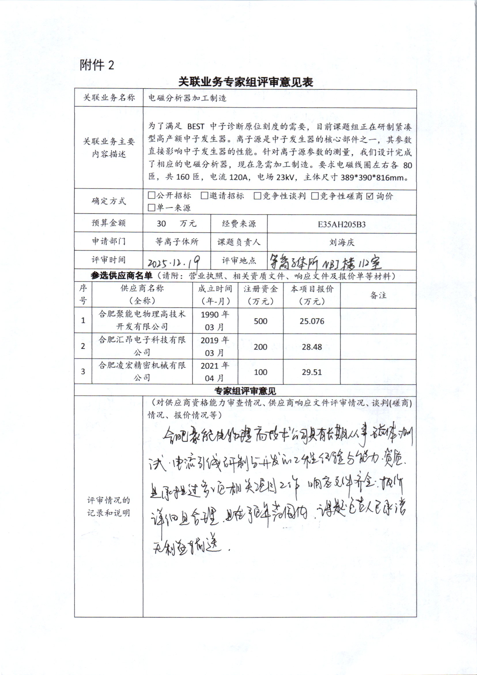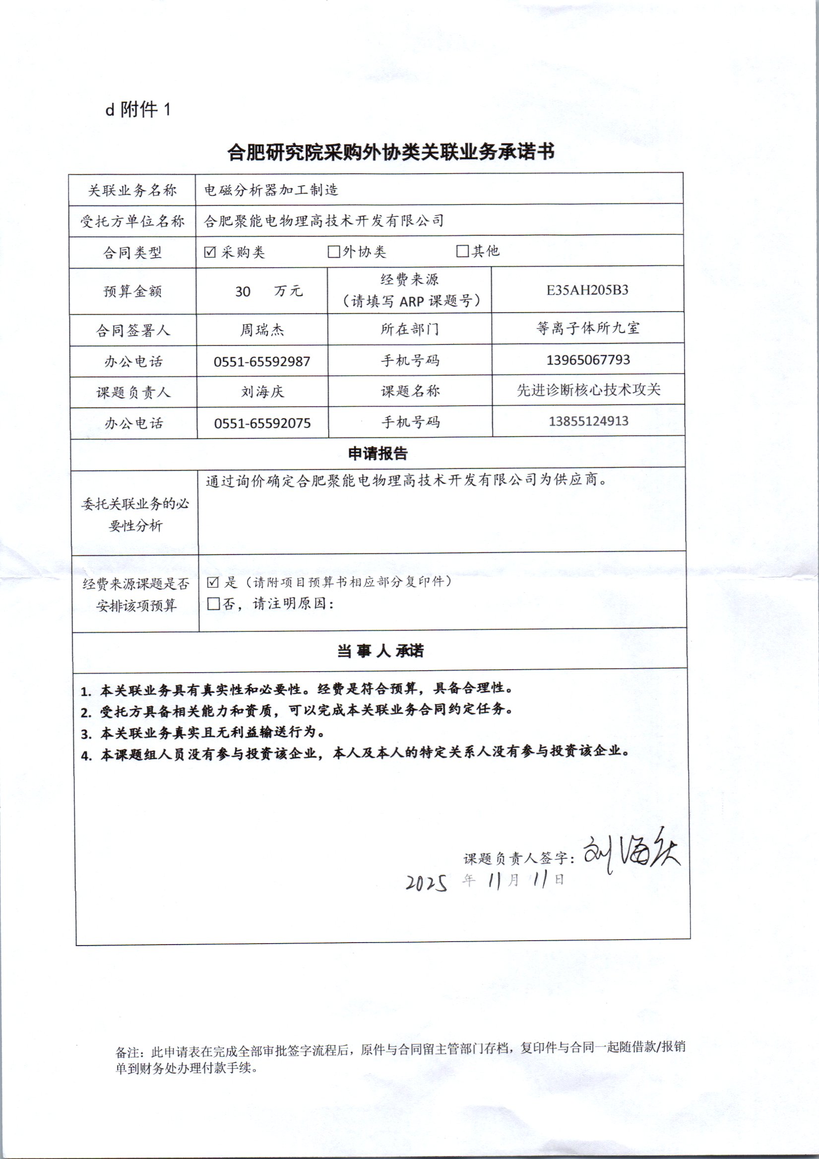 根据《中国科学院关于加强科研项目关联业务管理的暂行规定》(科发条财字〔2015〕125号)、《中国科学院合肥物质科学研究院关于加强科研项目关联业务管理的实施细则》(科合院发资字〔2021〕8号)、《合肥研究院加强关联业务管理暂行办法》(科合院发资字〔2022〕 1号)、《合肥物质院加强关联业务管理补充规定》(科合院发资字〔2025〕1号)要求,现就我院委托合肥聚能电物理高技术开发有限公司进行电磁分析器加工制造的关联业务做公示。