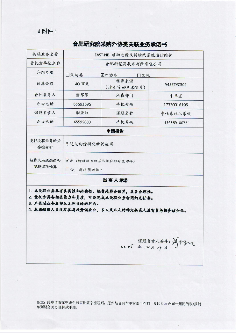 中国科学院合肥物质科学研究院等离子体物理研究所谢亚红老师委托合肥科聚高技术有限责任公司进行EAST-NBI辅助电源及传输线系统运行维护。该项目用于EAST-NBI 辅助电源及传输线系统运行维护,EAST-NBI辅助电源及传输线系统是NBI子系统之一, 是向EAST-NBI装置提供不同功率等级、不同脉宽的电力供应及传输,辅助电源包括灯丝电源、弧电源、缓冲器电源、负高压电源、高压平台、变压器及相关供配电等,电源传输线要求绝缘等级高,屏蔽环境要求高,其运行的稳定性和可靠性直接关乎整个NBI装置的安全运转,为了保障EAST-NBI高参数实验的安全稳定可靠运行,对辅助电源及传输线系统进行安全运行和定期维护至关重要。合肥科聚高技术有限责任公司自然人股东包括合肥科学岛控股有限公司,持股比例100%,本次采购构成关联业务交易。