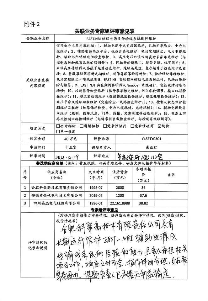 根据《中国科学院关于加强科研项目关联业务管理的暂行规定》(科发条财字〔2015〕125号)、《中国科学院合肥物质科学研究院关于加强科研项目关联业务管理的实施细则》(科合院发资字〔2021〕8号)、《合肥研究院加强关联业务管理暂行办法》(科合院发资字〔2022〕1号)、《合肥物质院加强关联业务管理补充规定》(科合院发资字〔2025〕1号)要求,现就委托合肥科聚高技术有限责任责任公司进行EAST-NBI辅助电源及传输线系统运行维护的关联业务做公示。