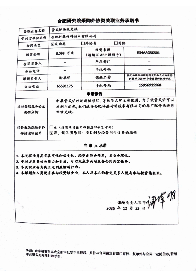 根据《中国科学院关于加强科研项目关联业务管理的暂行规定》(科发条财字〔2015〕125号)、《中国科学院合肥物质科学研究院关于加强科研项目关联业务管理的实施细则》(科合院发资字〔2021〕8号)、《合肥研究院加强关联业务管理暂行办法》(科合院发资字〔2022〕1号)、《合肥物质院加强关联业务管理补充规定》(科合院发资字〔2025〕1号)要求,现就我院委托合肥科晶材料技术有限公司进行管式炉面板更换做关联业务公示。