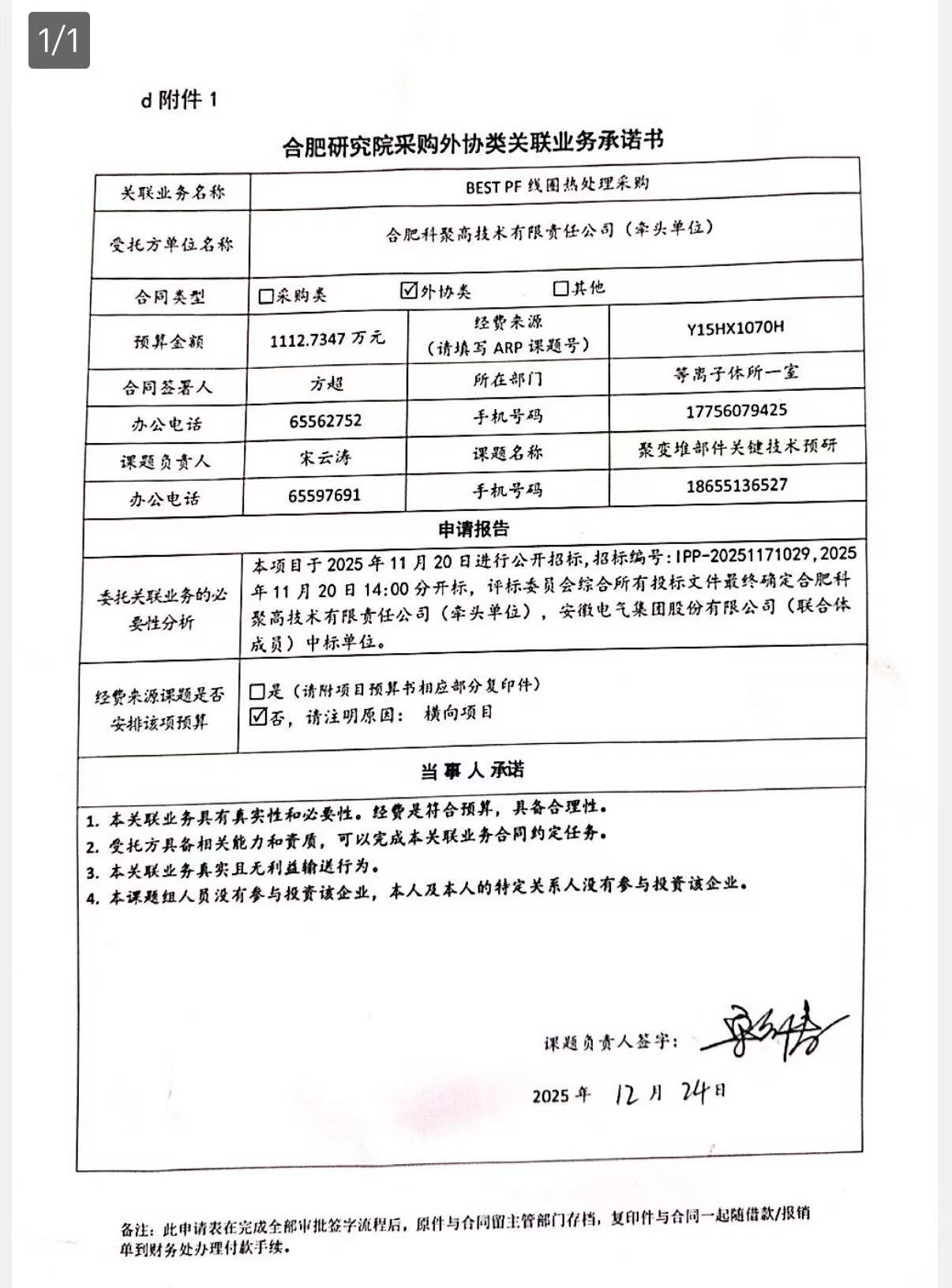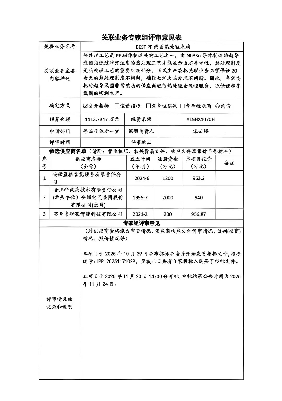 根据《中国科学院关于加强科研项目关联业务管理的暂行规定》(科发条财字〔2015〕125号)、《中国科学院合肥物质科学研究院关于加强科研项目关联业务管理的实施细则》(科合院发资字〔2021〕8号)、《合肥研究院加强关联业务管理暂行办法》(科合院发资字〔2022〕1号)、《合肥物质院加强关联业务管理补充规定》(科合院发资字〔2025〕1号)要求,现就委托合肥科聚高技术有限责任责任公司进行BEST PF线圈热处理的关联业务做公示。