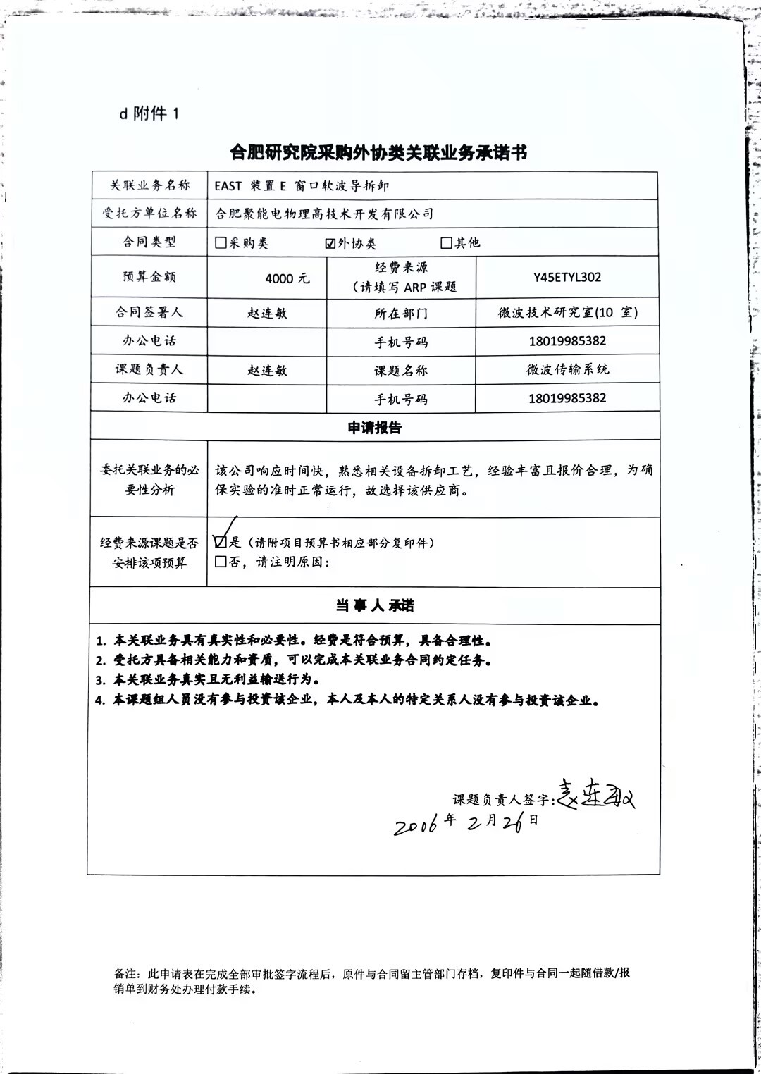 中国科学院合肥物质科学研究院等离子体物理研究所赵连敏老师委托合肥聚能电物理高技术开发有限公司进行EAST装置E窗口软波导拆卸。为了配合EAST一6MW-4.6GHz低杂波系统物理实验,需要将低杂波天线从EAST装置真空室退出60mm,而这60mm的移动量需要传输系统吸收,由于系统本身吸收不了60mm的形变,需要更换软波导配合天线的移动。合肥聚能电物理高技术开发有限公司股东之一为合肥科学岛控股有限公司,该公司在其中占股35%,本次构成关联业务交易。