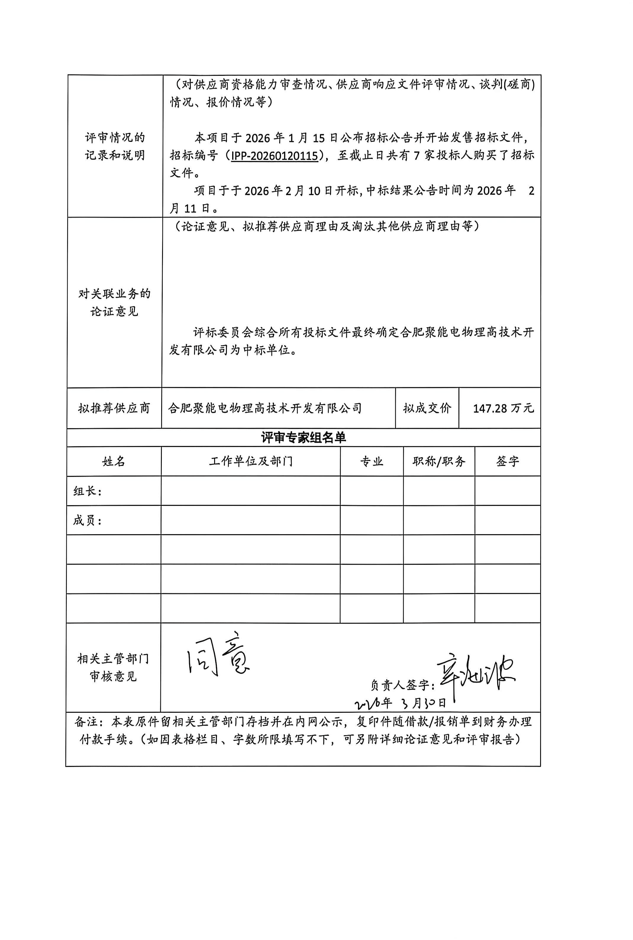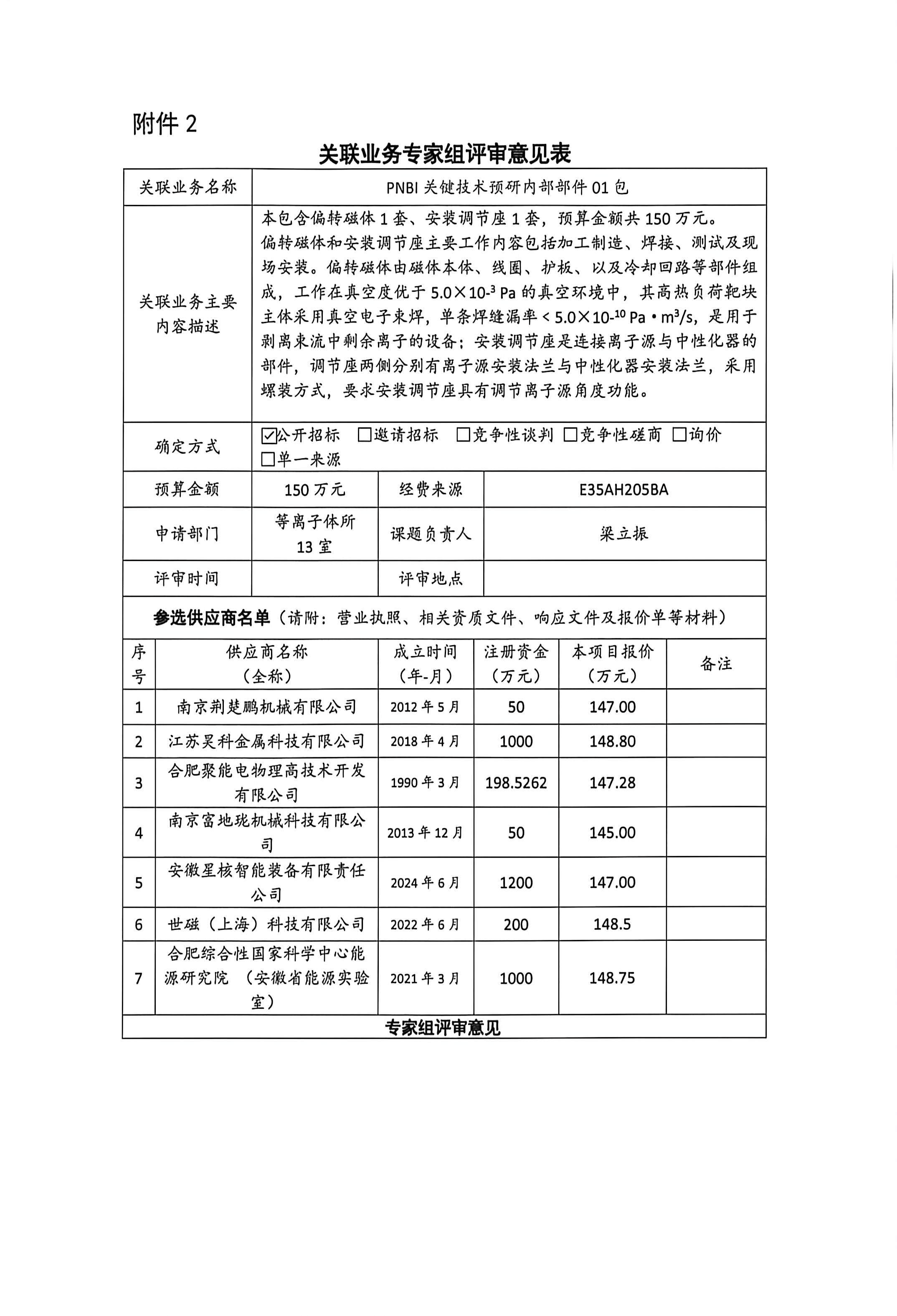 根据《中国科学院关于加强科研项目关联业务管理的暂行规定》(科发条财字〔2015〕125号)、《中国科学院合肥物质科学研究院关于加强科研项目关联业务管理的实施细则》(科合院发资字〔2021〕8号)、《合肥研究院加强关联业务管理暂行办法》(科合院发资字〔2022〕 1号)、《合肥物质院加强关联业务管理补充规定》(科合院发资字〔2025〕1号)要求,现就我院委托合肥聚能电物理高技术开发有限公司进行PNBI关键技术预研内部部件(01包)的关联业务做公示。
