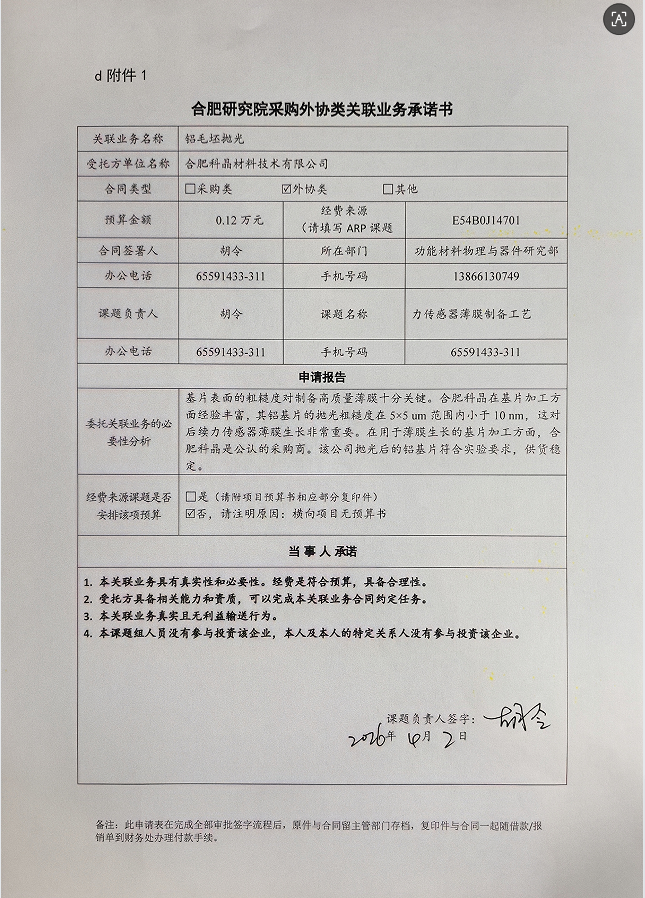 中国科学院合肥物质科学研究院固体物理研究所胡令老师委托合肥科晶材料技术有限公司进行铝毛坯抛光。该材料用于薄膜生长的基片。合肥科晶材料技术有限公司是由合肥科学岛控股有限公司与材料技术国际公司合资成立,合肥科学岛控股有限公司占股19.77%,本次采购构成关联业务交易。