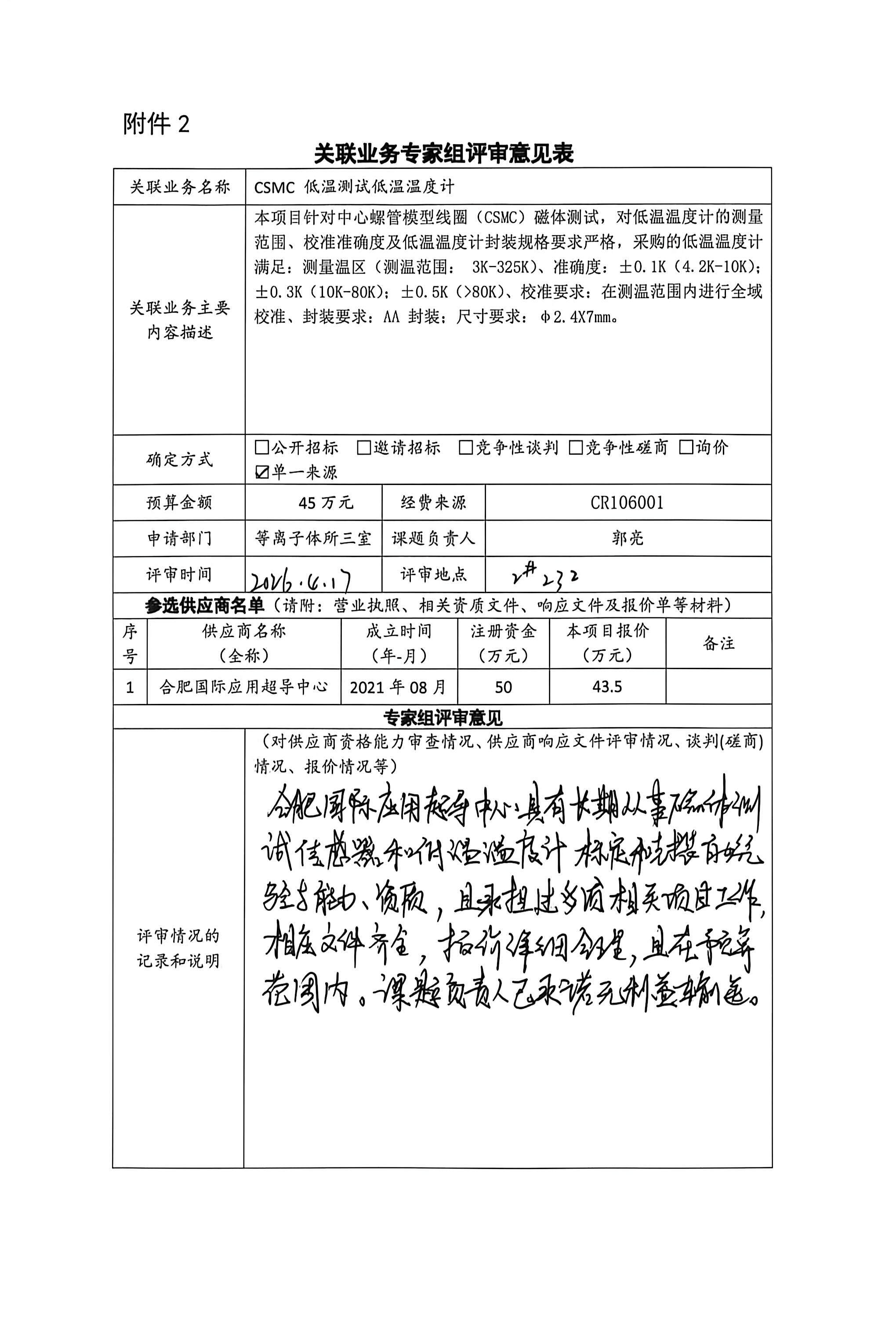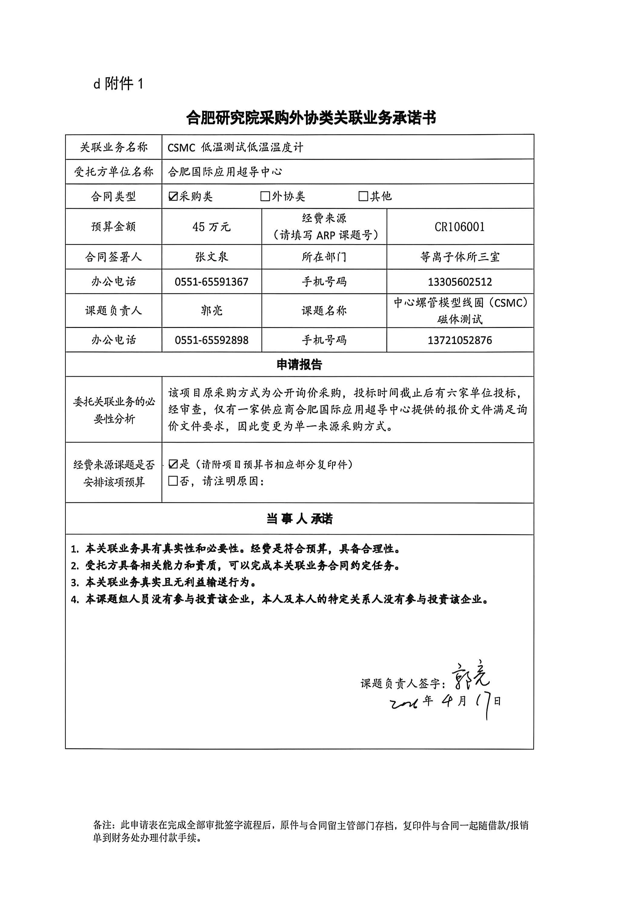根据《中国科学院关于加强科研项目关联业务管理的暂行规定》(科发条财字〔2015〕125号)、《中国科学院合肥物质科学研究院关于加强科研项目关联业务管理的实施细则》(科合院发资字〔2021〕8号)、《合肥研究院加强关联业务管理暂行办法》(科合院发资字〔2022〕1号)、《合肥物质院加强关联业务管理补充规定》(科合院发资字〔2025〕1号)要求,现就我院从合肥国际应用超导中心采购CSMC 低温测试低温温度计做关联业务公示。